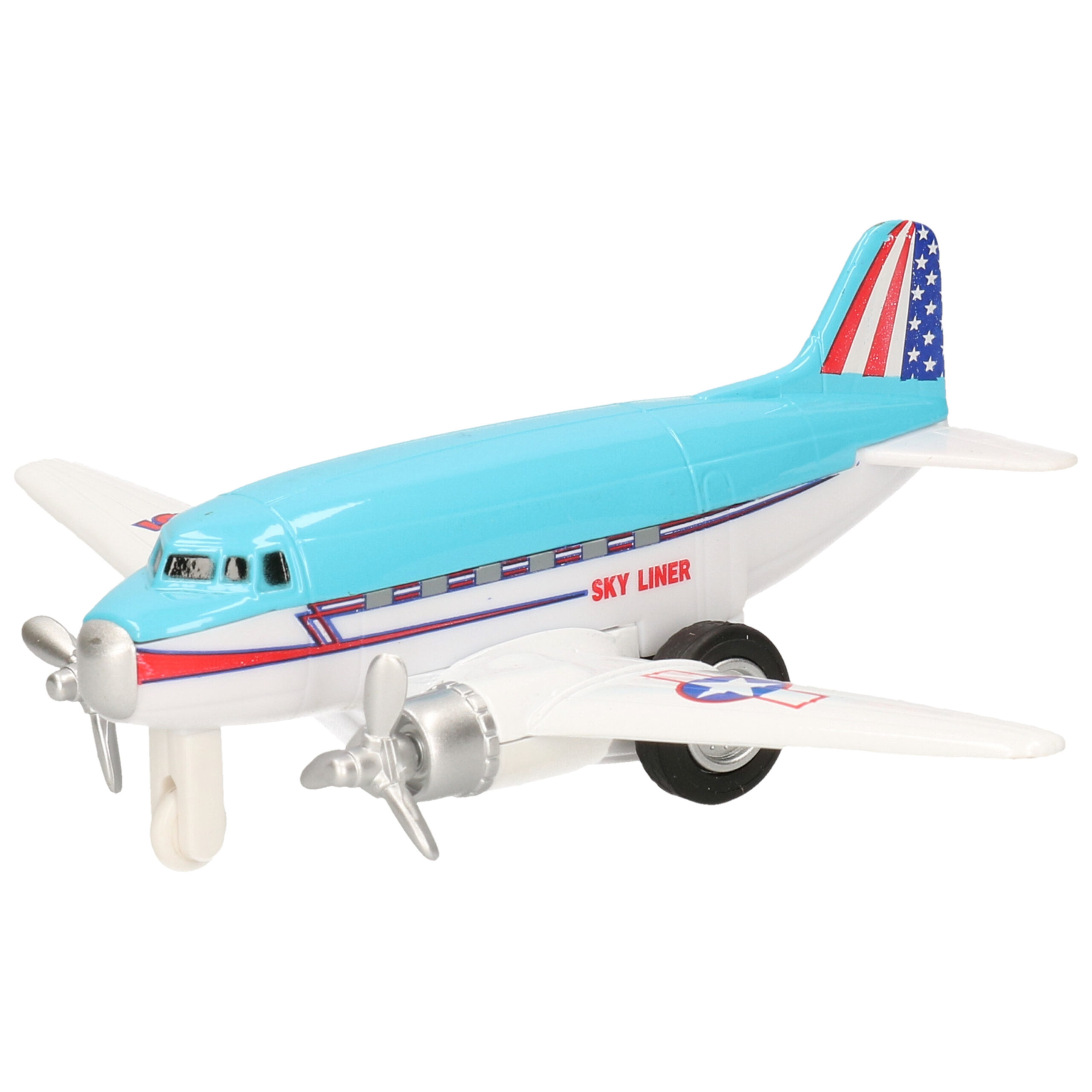 Dubbele propeller vliegtuig turquoise 12 cm. Turquoise metalen dubbele propeller vliegtuigje met pull-back motor. Het vliegtuigje kan naar achteren gereden worden, waarna deze naar voren schiet. Het vliegtuig heeft een lengte van 12 cm.