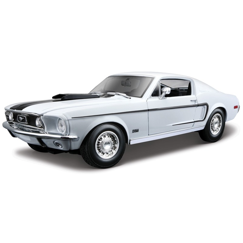 Modelauto van de Ford Mustang GT Cobra 1968. Schaal: 1:18. Lengte: ongeveer 24 cm. Merk: Maisto. Materiaal: metaal/kunststof. Speelgoed auto schaalmodel in de kleur wit/zwart. + De beste replica schaalmodellen voertuigen van metaal. Als decoratie of voor uren speelplezier.