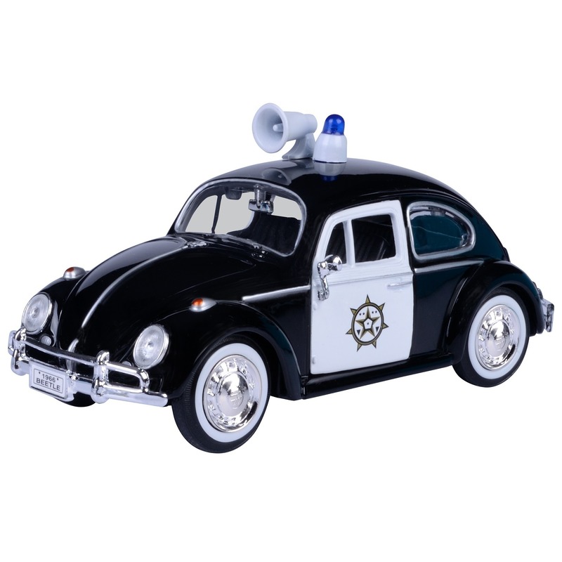 Politie modelauto van de Volkswagen Kever. Merk: Motormax. Schaal 1:24. Lengte: ca. 17 cm. Materiaal: metaal. Speelgoed auto schaalmodel in de kleur zwart/wit. + De beste replica schaalmodellen voertuigen van metaal. Als decoratie of voor uren speelplezier. Let op: dit is geen speelgoed en niet geschikt voor kinderen.
