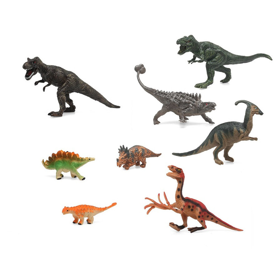 Set van 8x stuks kunststof speelgoed dino dieren speelfiguurtjes. Materiaal: kunststof (PVC). Het formaat van de speeldiertjes varieert tussen de 5 en 13 cm. Dino dieren speelfiguren in diverse soorten.