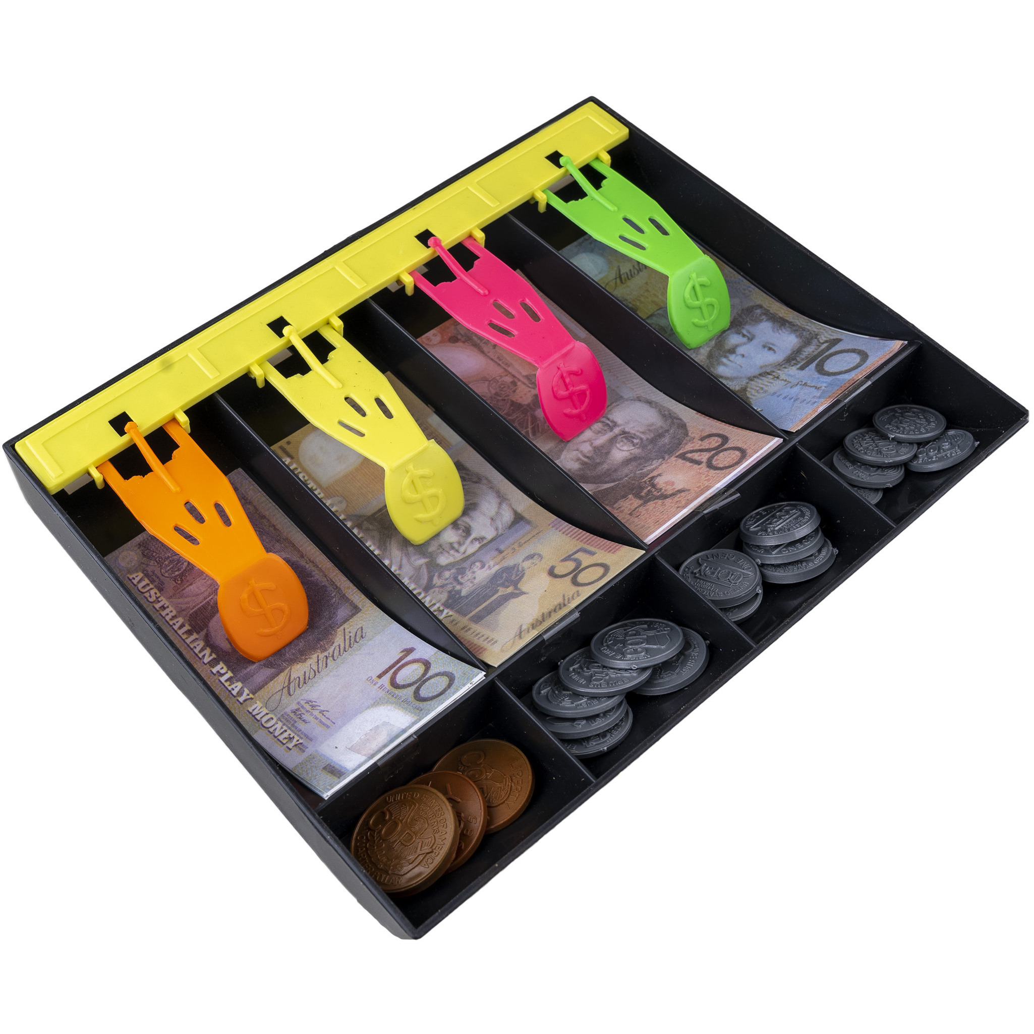 Speelgoed/verkleed thema geld in kassa lade, gemaakt van papier en kunststof. Een kleine verzameling papiergeld en munten zodat uw kind urenlang kan spelen. Niet geschikt voor kinderen onder de 3 jaar.