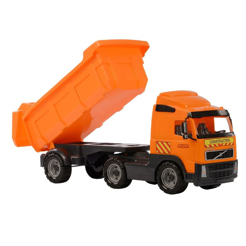 Een grote oranje speelgoed Volvo auto/truck/kiepwagen, met kantelbare laadbak/achterklep/oplegger. De laadbak is tevens afneembaar, zodat de vrachtwagen ook zonder bak kan worden gebruikt. Afmeting: 59 x 19 x 25 cm. Materiaal: stevig kunststof/metaal. Speelgoed auto’s kiepwagens voor binnen en buiten voor kinderen/jongens.