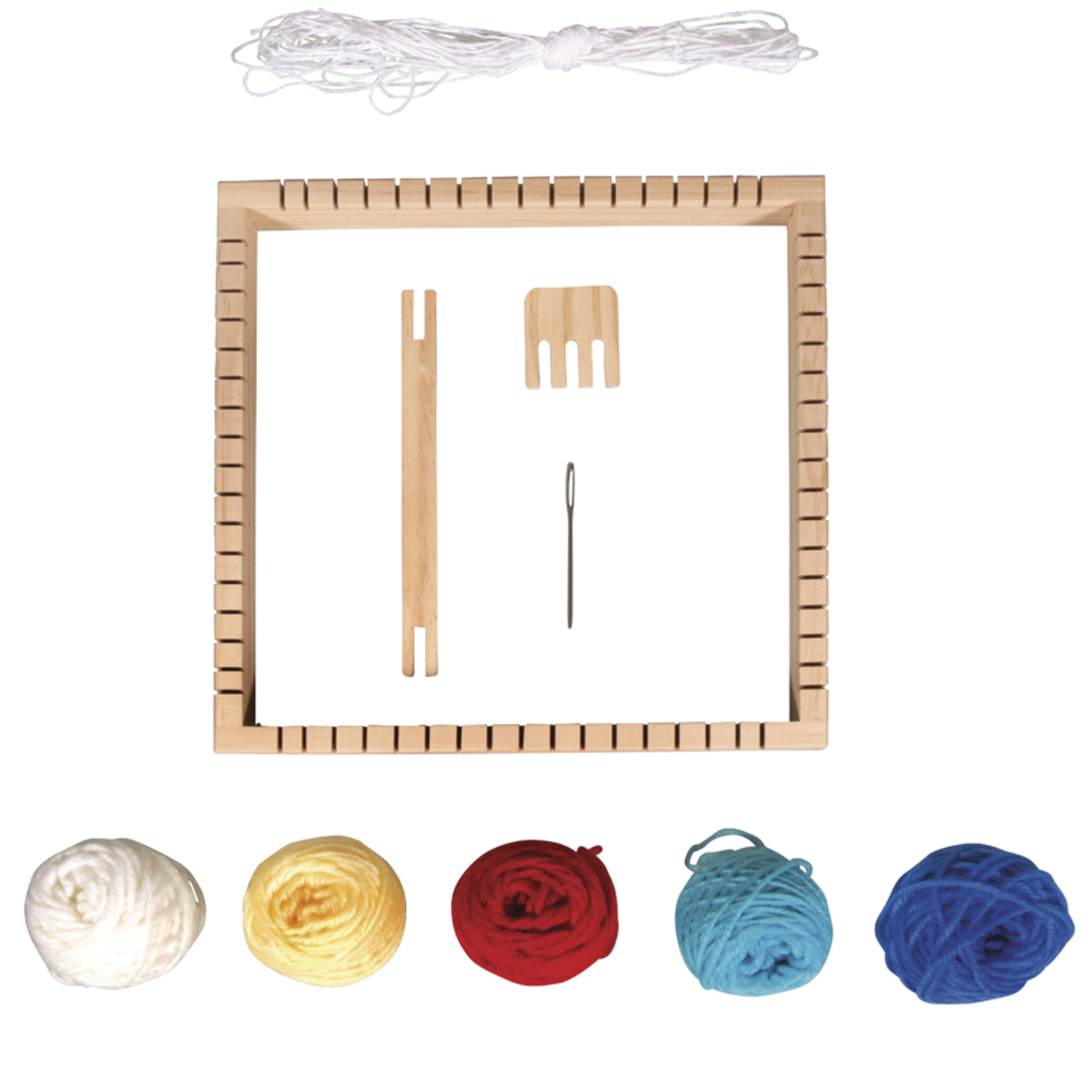 Speelgoed/knutsel/hobby Weefraam, 9-delig. Ontdek de magie van weven! Met dit 9-delige vierkante weefraam van 23 cm maken kinderen in een handomdraai hun eigen kunstwerkjes van draad en stof. Het houten frame is FSC-gecertificeerd en ligt lekker in de hand, terwijl de bijgeleverde accessoires het extra makkelijk maken om meteen aan de slag te gaan. Van kleurrijke onderzetters tot vrolijke wanddecoraties ? dit weefraam is de perfecte kennismaking met een tijdloze hobby. Spelenderwijs ontwikkelen kinderen hun creativiteit ?n fijne motoriek. Inclusief 5 bolletjes wol van ca. 10 gram in de kleuren: wit, geel, rood, blauw en donkerblauw, weefraam, weefhoutje, kleine weefkam en 1 naald.