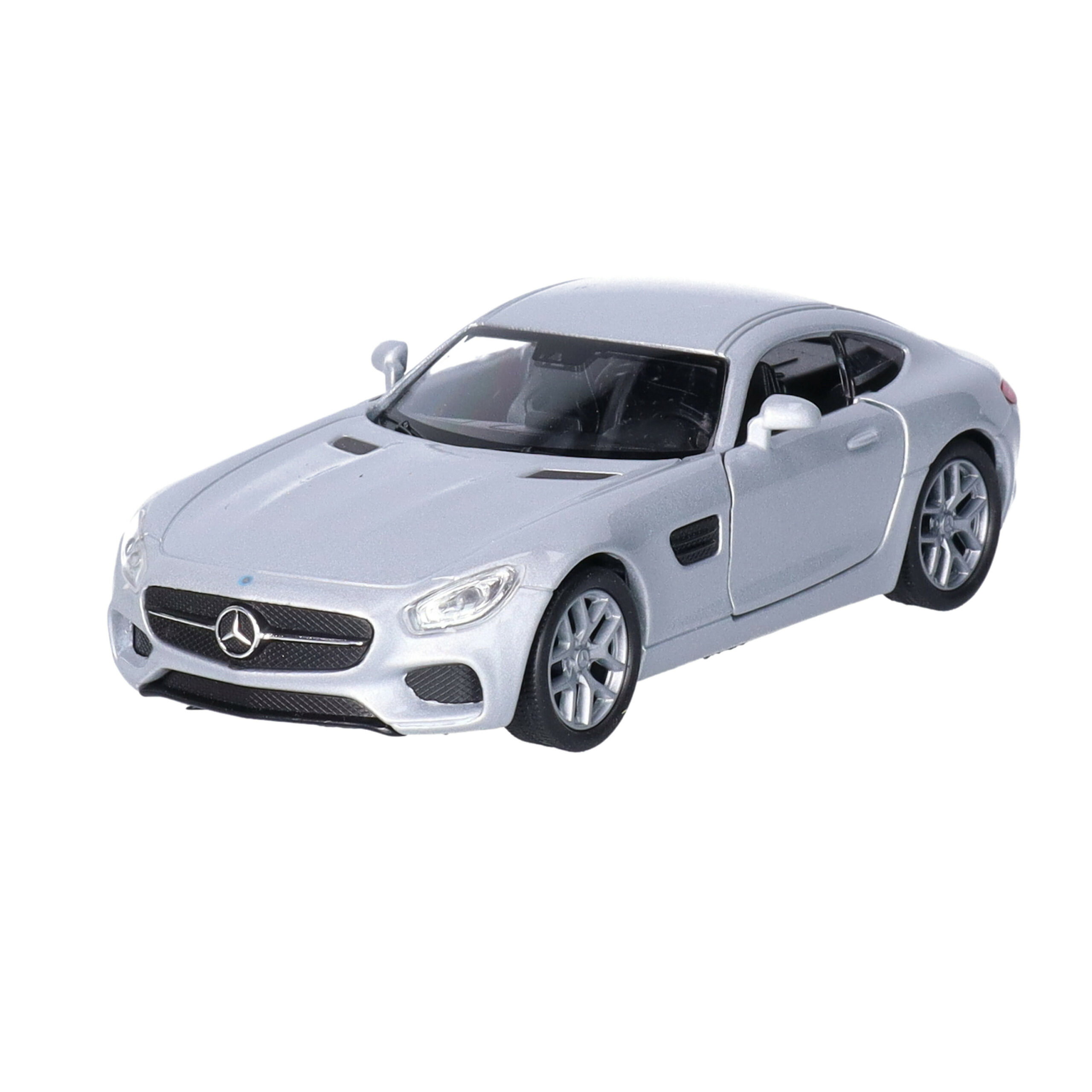 Mercedes Benz speelgoedautootje van model AMG GT. De speelgoedauto is ongeveer 11 x 4 cm en is in de kleur zilver. De die-cast auto is gemaakt van metaal en plastic. Leuk als decoratie of om uren mee te spelen. Deuren kunnen open. Schaalmodellen om te sparen.