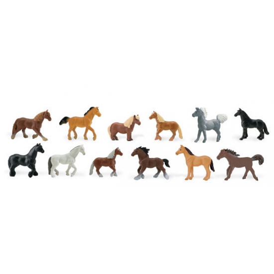 Plastic speelgoed figuren paarden 12 stuks. Koker met 12 verschillende soorten paarden. De plastic paardjes varieren van 4 tot 7,5 cm en zijn verpakt per 12 stuks.