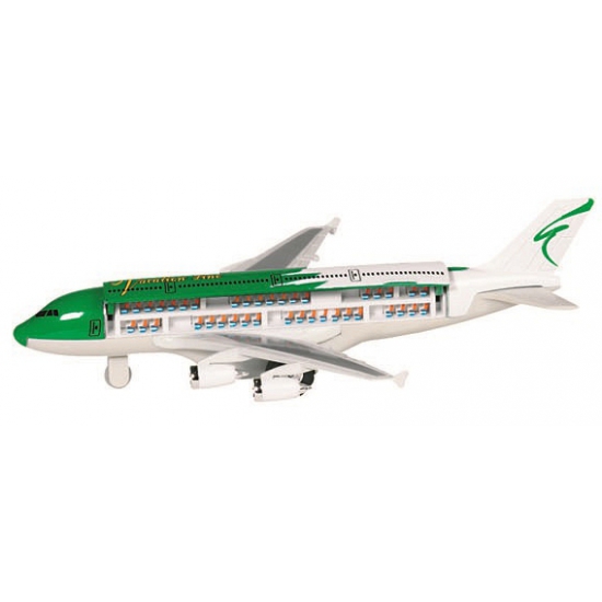 Speelgoed passagiers vliegtuig groen/wit 19 cm. Ga op avontuur met dit stoere groen/witte speelgoed passagiersvliegtuig van 19 cm! Dit metalen vliegtuig is voorzien van een pull-back motor: trek het vliegtuigje naar achteren en laat het vanzelf vooruit rijden ? gegarandeerd speelplezier!