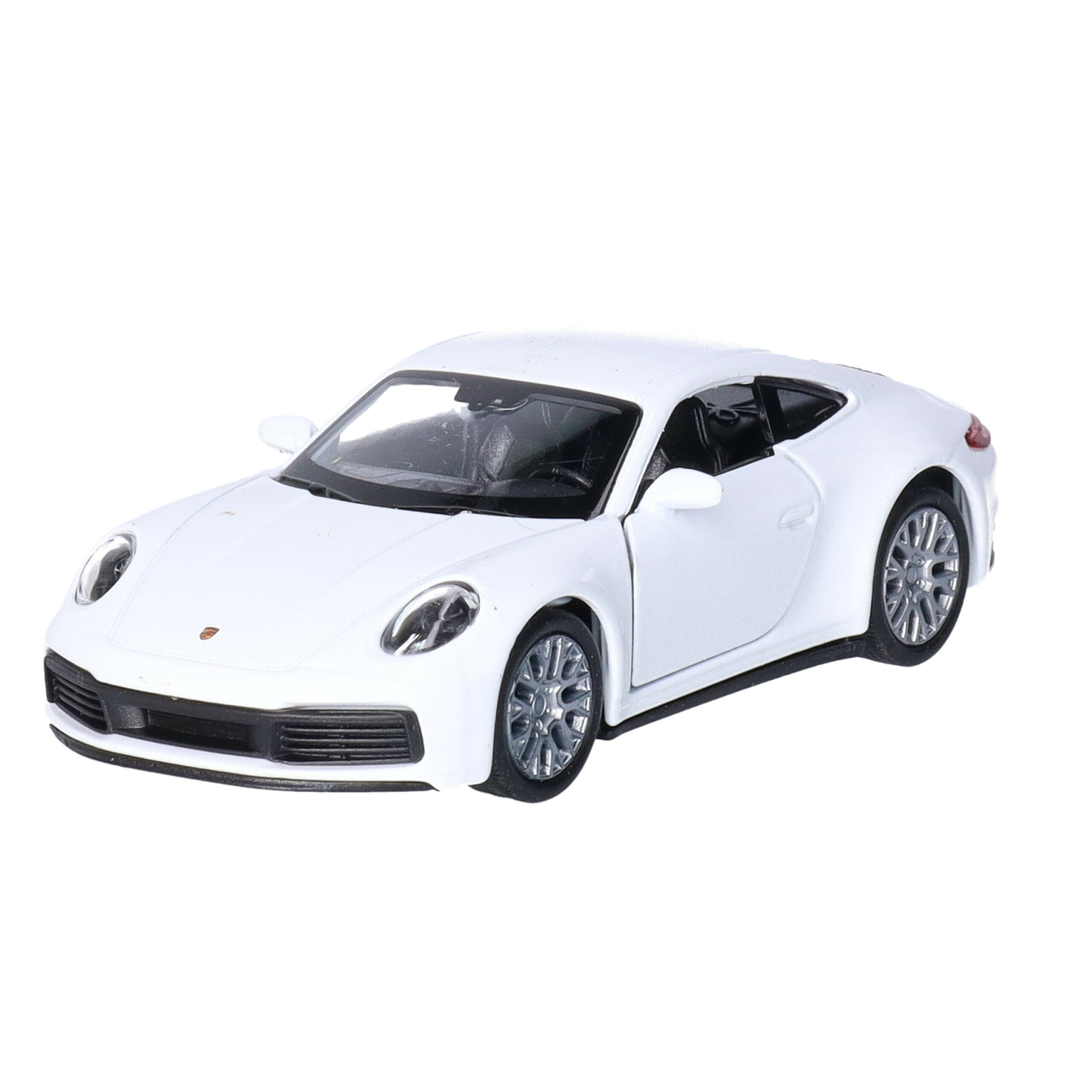 Porsche speelgoedautootje van model 911 Carrera. De speelgoedauto is ongeveer 11 x 4 cm en is in de kleur wit. De die-cast auto is gemaakt van metaal en plastic. Leuk als decoratie of om uren mee te spelen. Deuren kunnen open. Schaalmodellen om te sparen.