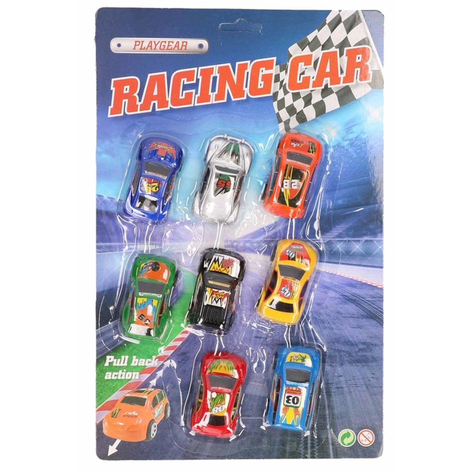 8x stuks race speelgoed auto’s set. Deze race autootjes zijn in allerlei verschillende kleuren. Je laat de pullback auto racen door middel van het achteruit trekken van het autootje en dan los te laten. Afmeting van 1 autootje ca: L 5,5 x B 2,5 x H 2 cm.