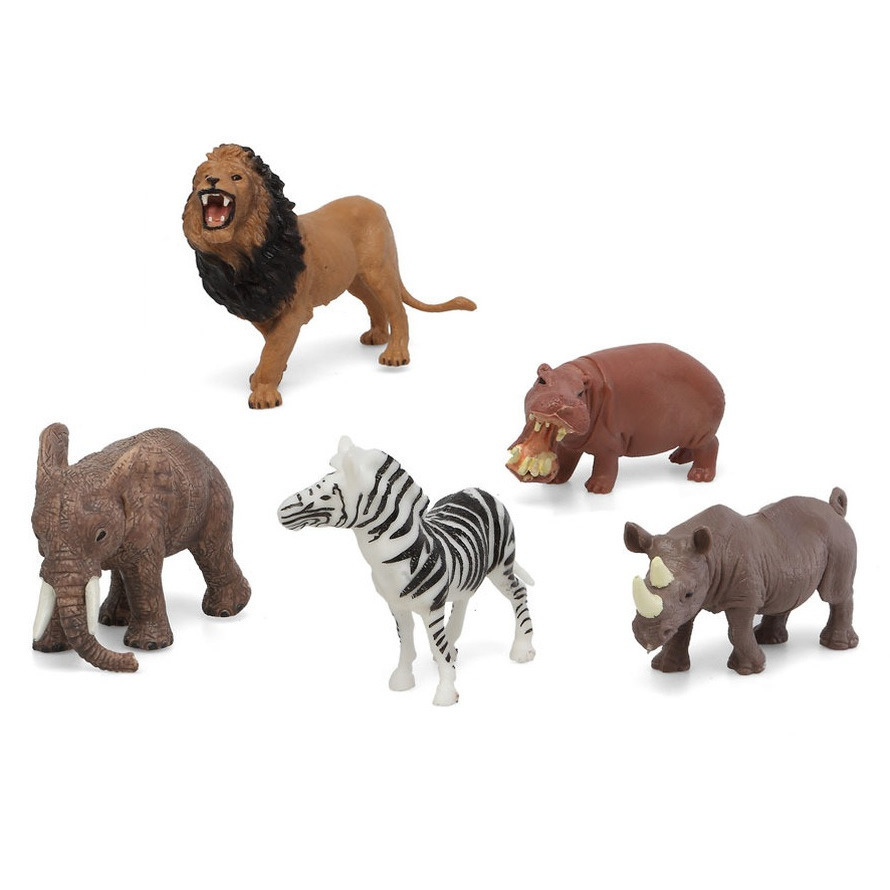 Speelgoed safari jungle dieren figuren 5x stuks. Materiaal: kunststof. De afmetingen variëren van ca. 11 x 8 cm / 7 x 7 cm.