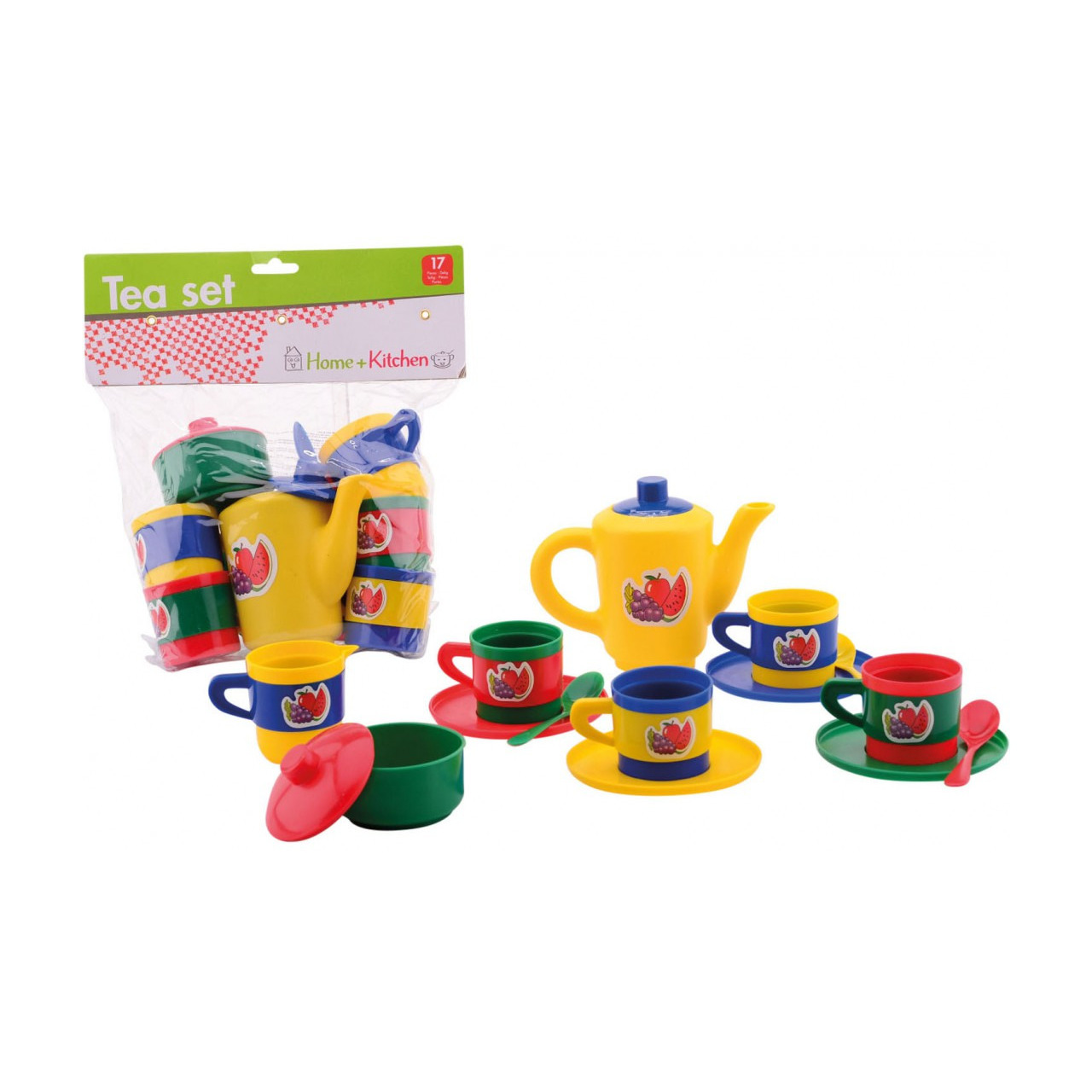 17 delige speelgoed thee set, gemaakt van duurzaam plastic. Bestaande uit: 5 kopjes, 5 schoteltjes, 5 lepeltjes, 1 pannetje en 1 theepot.