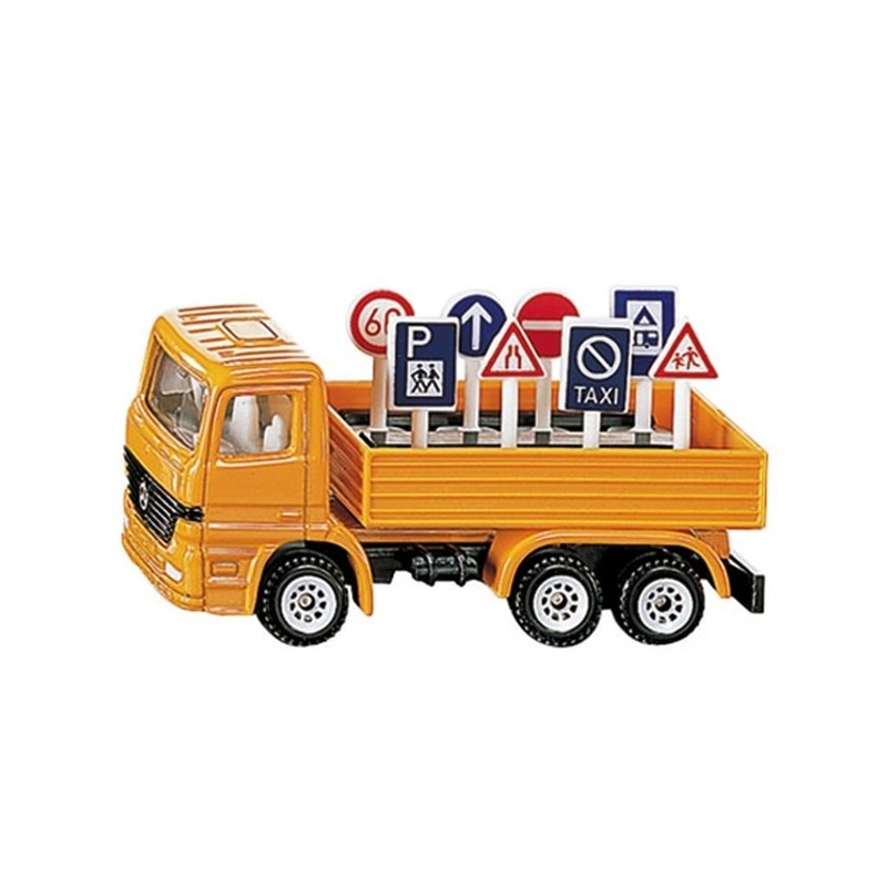Siku vrachtwagen met verkeersbordjes. Siku speelgoed vrachtwagen met houder. Schaal: 1:87. Lengte: ongeveer 8 cm.