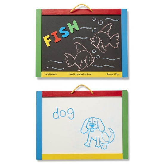 Magnetisch krijtbord en whiteboard 30 x 40 cm. Dit schoolbord heeft aan een kant een magnetisch whiteboard en aan de andere kant een magnetisch krijtbord. Incl. krijt, whiteboard marker, wisser en 36 letters/cijfers. Afmeting: 30 x 40 x 2 cm.
