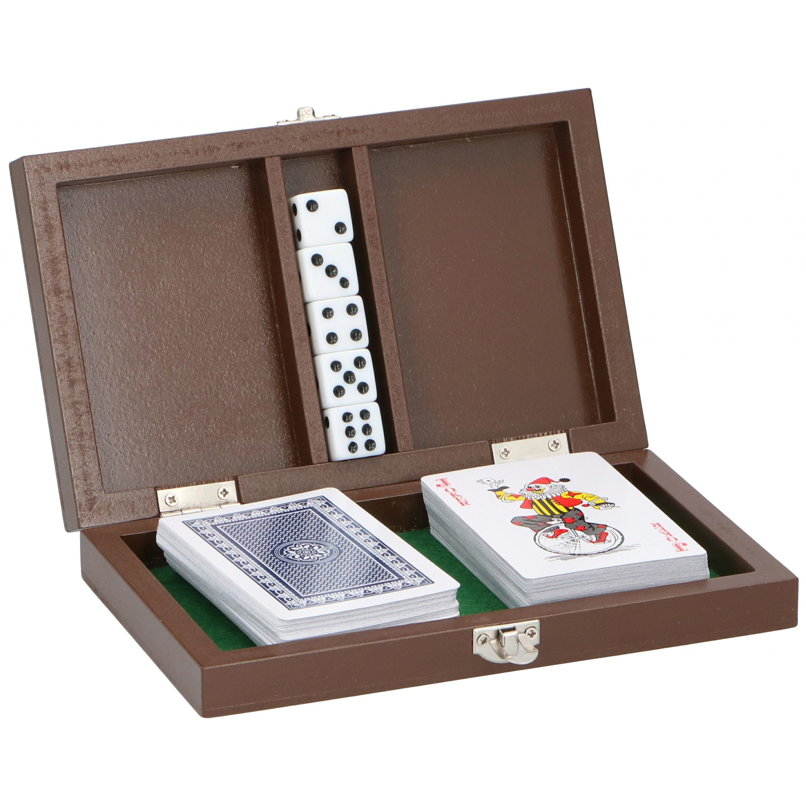 In deze set zitten 2 pakjes kaartspellen en 5 dobbelstenen. Deze speelkaarten en dobbelstenen worden geleverd in een luxe houten kistje/bewaardoosje. Afmetingen: ca. 18 x 11 x 3 cm. Kaartspellen setjes in luxe bewaarbox/cadeauverpakking. Let op: dit is geen speelgoed en niet geschikt voor kinderen.