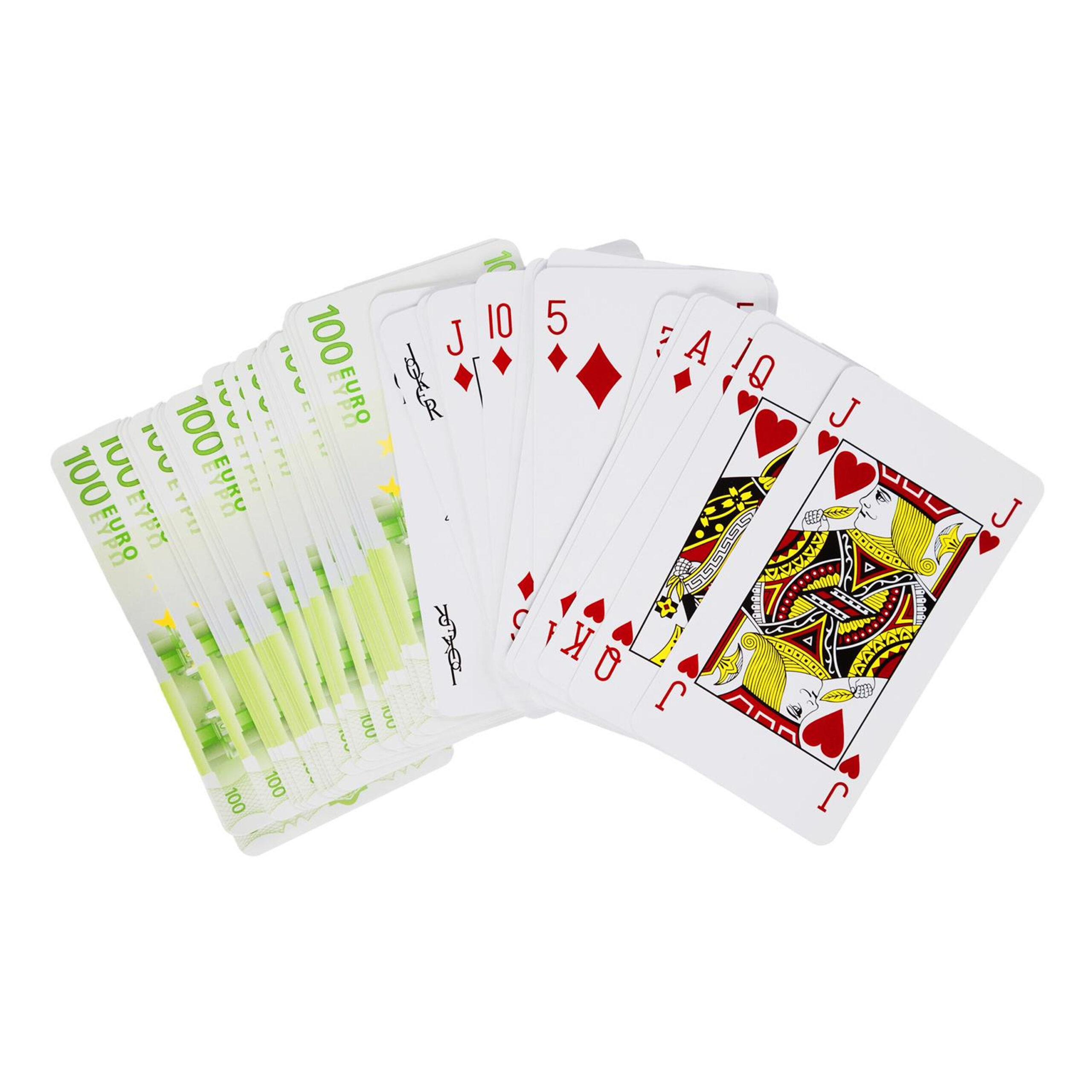 Speelkaarten van Home deco factory. Dit setje speelkaarten is perfect voor een breed scala aan kaartspellen, zoals poker, bridge, pesten, en vele andere. Het doosje bevat 54 kaarten, inclusief twee jokers, allemaal gedrukt op geplastificeerd papier voor een langdurige speelervaring. De klassieke en Engelse bedrukking, met grote index voor cijfers en letters, maakt de kaarten gemakkelijk leesbaar, zelfs van een afstand. Of je nu een doorgewinterde kaartspeler bent of gewoon een gezellige spelavond met vrienden wilt organiseren, deze speelkaarten zijn een must-have voor je collectie. De kaarten hebben een euro biljet als achterzijde.