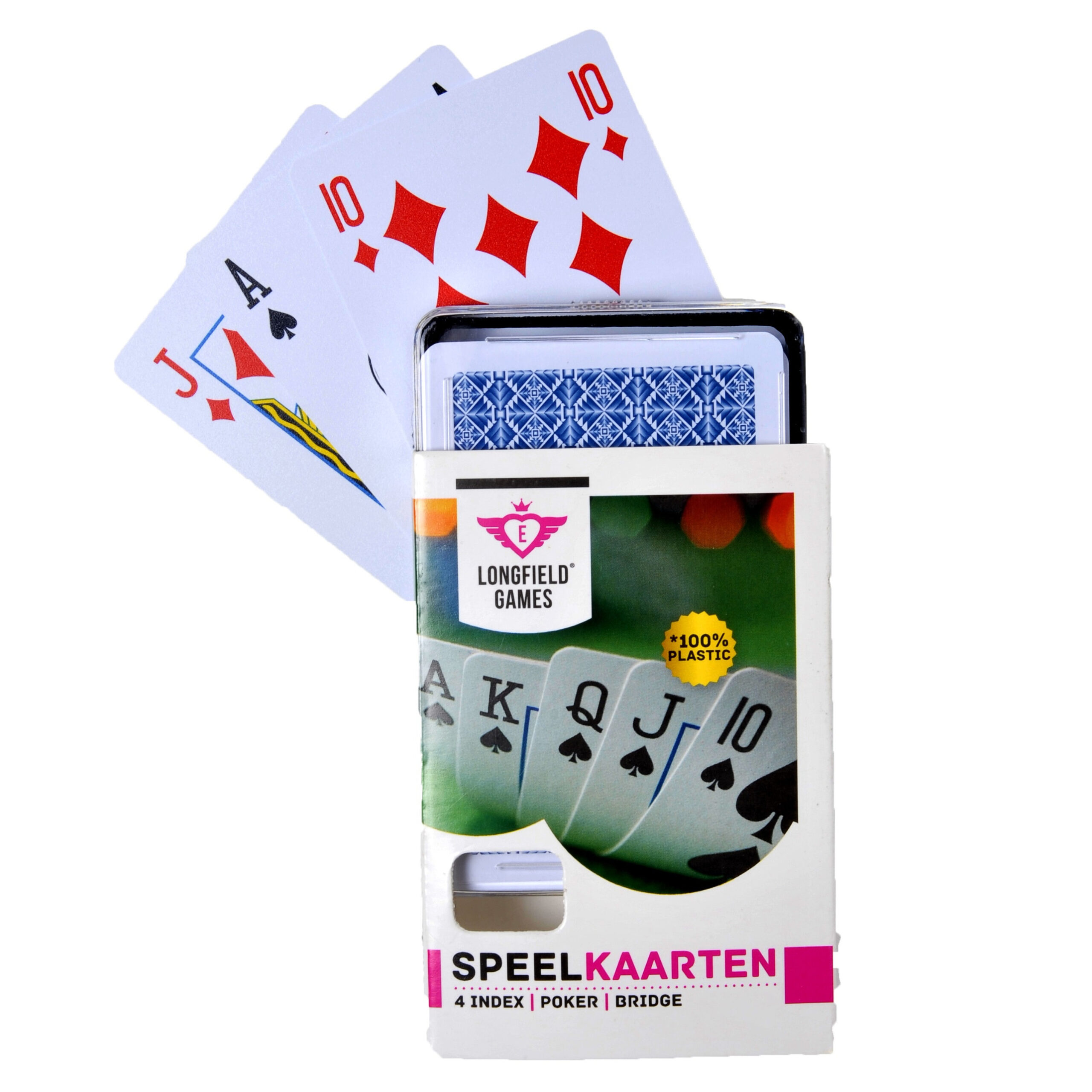 Speelkaarten – geplastificeerd papier – kunststof box – poker/bridge – Kaartspellen – Pesten/pokeren. Een klassiek kaartspel in een stevige kunststof bewaarbox. Deze set bevat 1 pak speelkaarten met 54 kaarten, ideaal voor poker, bridge, pesten of andere kaartspellen. De kaarten zijn gemaakt van geplastificeerd papier en bedrukt met de bekende Engelse symbolen (K, Q, J). Door de gladde afwerking zijn ze prettig in gebruik en eenvoudig te schudden. Compact en handig om mee te nemen, perfect voor thuis, op reis of een spelletjesavond met vrienden.