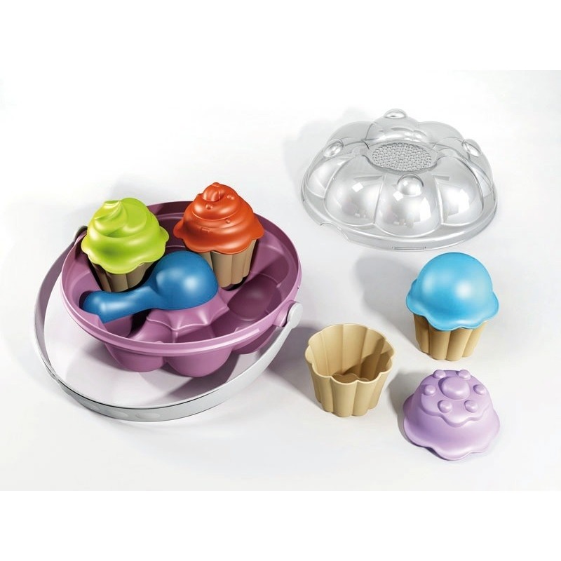 Speelset cupcake zandvormen in emmer. Met dit cupcake setje bak je de mooiste zandtaartjes! De set bestaat uit een emmer in de vorm van een tulband bakvorm met 4 cupcake vormpjes, 4 toppings die op de vormpjes passen, en een schepje. Materiaal: Kunststof.