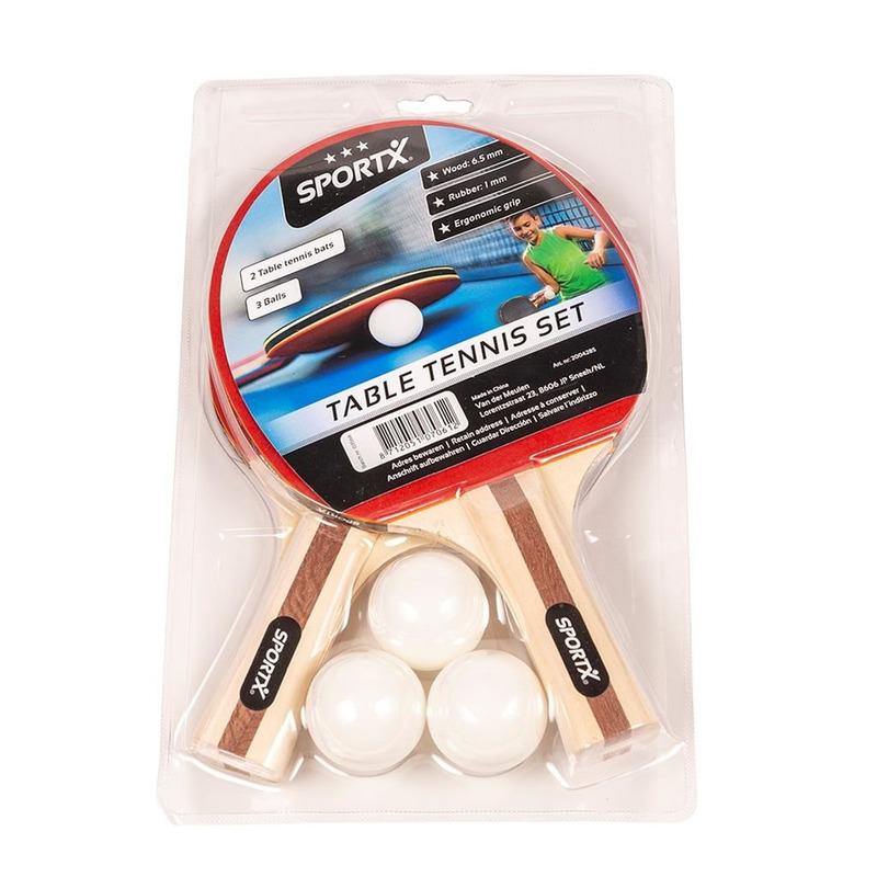 Tafeltennis 2x stuks batjes Ping Pong set met 3 ballen. In blister verpakking. Voor thuis of op kantoor. Kwaliteit van de batjes: 2 sterren. Dikte rubber: 1 mm. Dikte hout: 6.5 mm. Materiaal van de ballen: ABS.