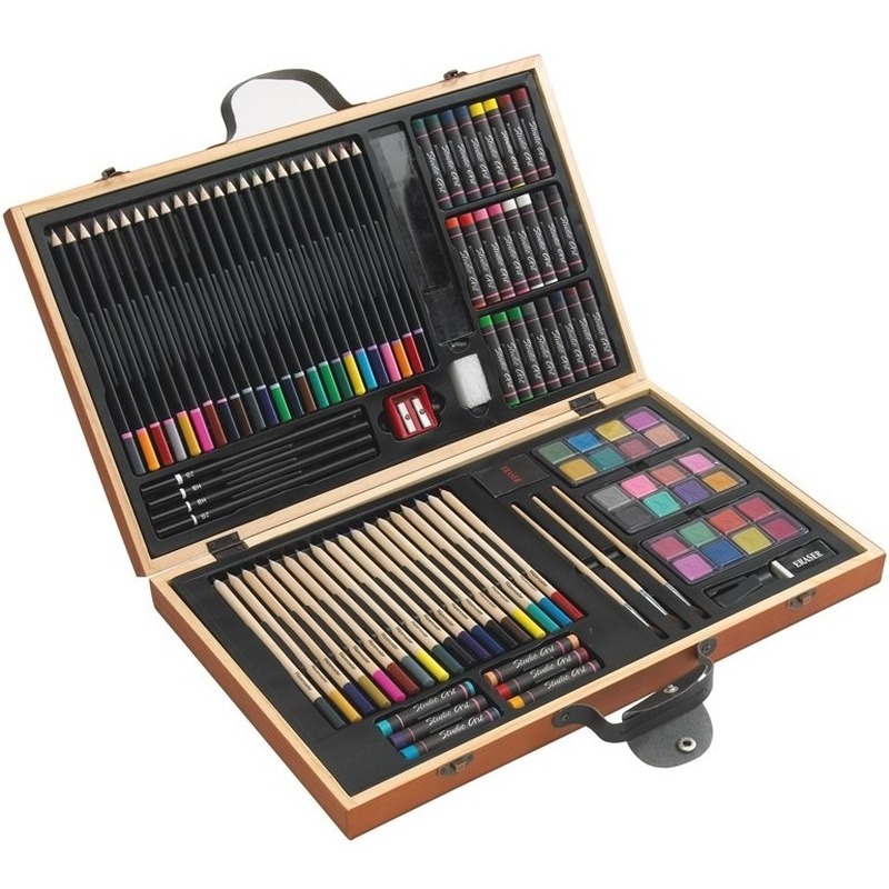 De set bestaat onder andere uit 24 kleurpotloden, 18 watercolor potloden, 30 wasco krijtjes en 24 kleuren waterverf. Ook inbegrepen: 2 HB potloden, 2 2B potloden, penselen, gummen, een liniaal en zelfs een nietmachine. Alles netjes opgeborgen in een stevige houten koffer van ca. 43 x 26 x 5 cm.