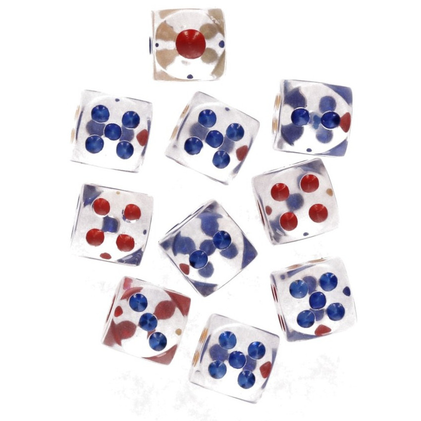 Setje van 30 losse dobbelstenen op blisterkaart. De dobbelstenen zijn transparant met rode, gele en blauwe stippen.