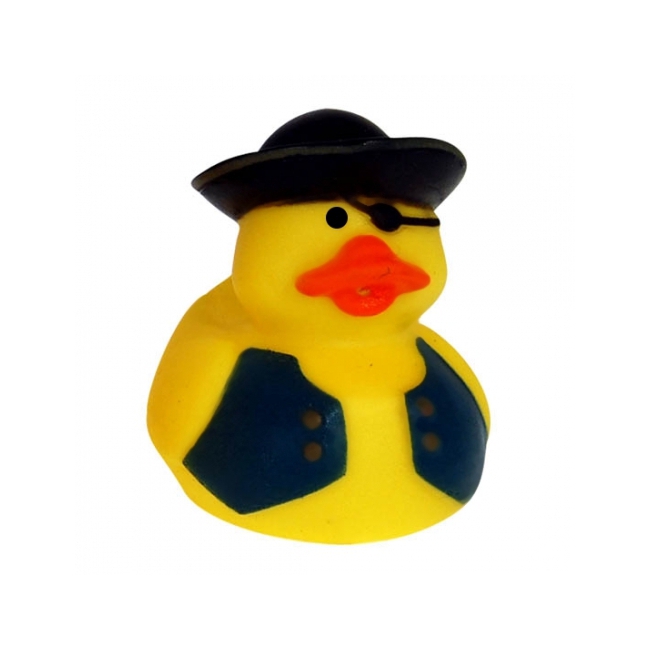Badeendje Piraat Jones 5 cm. Rubberen badeendje piraat Black in de stijl van een piraat met een zwarte hoed, Jones zwart vest en een ooglapje. Het badeendje heeft een formaat van 5 cm.