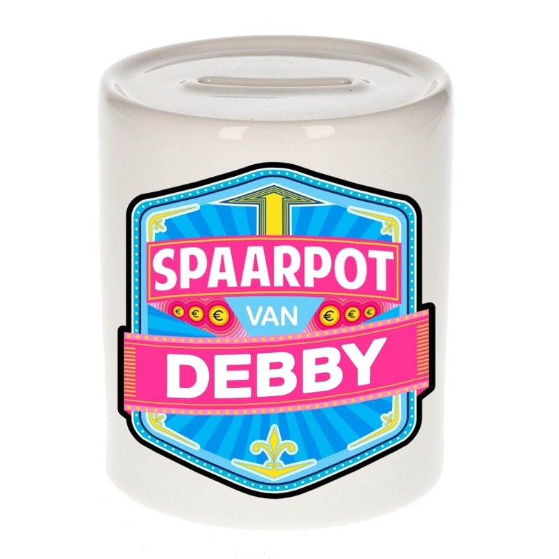 Kinder spaarpot voor Debby. Leuke kinder spaarpot met een vrolijk gekleurde opdruk. Deze kinder spaarpot voor Debby is gemaakt van keramiek en heeft een diameter van 8 cm en een hoogte van 9 cm.
