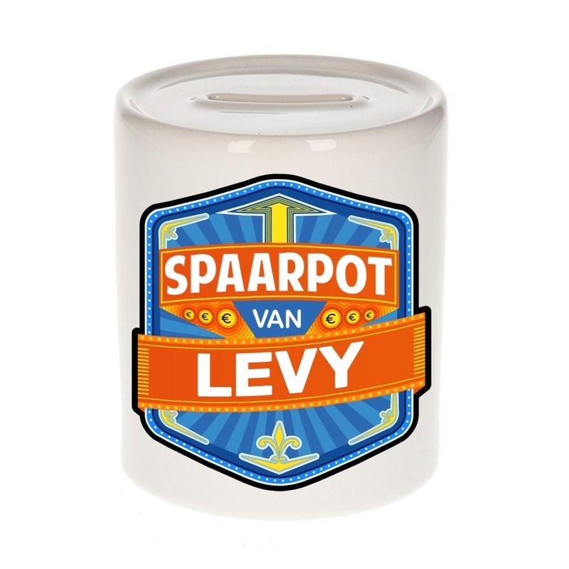 Kinder spaarpot voor Levy. Leuke kinder spaarpot met een vrolijk gekleurde opdruk. Deze kinder spaarpot voor Levy is gemaakt van keramiek en heeft een diameter van 8 cm en een hoogte van 9 cm.