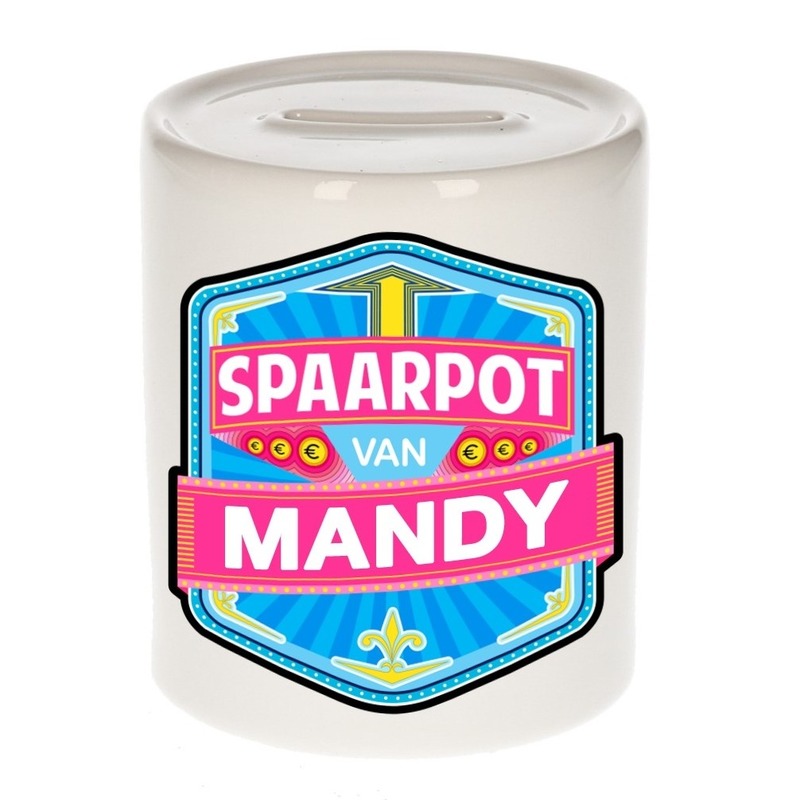 Kinder spaarpot voor Mandy. Leuke kinder spaarpot met een vrolijk gekleurde opdruk. Deze kinder spaarpot voor Mandy is gemaakt van keramiek en heeft een diameter van 8 cm en een hoogte van 9 cm.