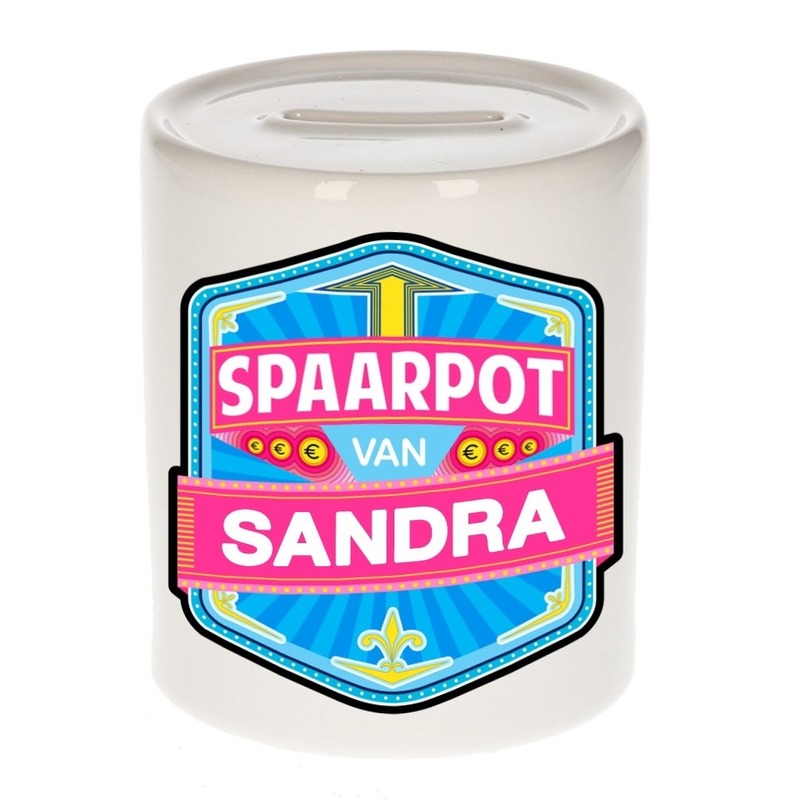 Kinder spaarpot voor Sandra. Leuke kinder spaarpot met een vrolijk gekleurde opdruk. Deze kinder spaarpot voor Sandra is gemaakt van keramiek en heeft een diameter van 8 cm en een hoogte van 9 cm.