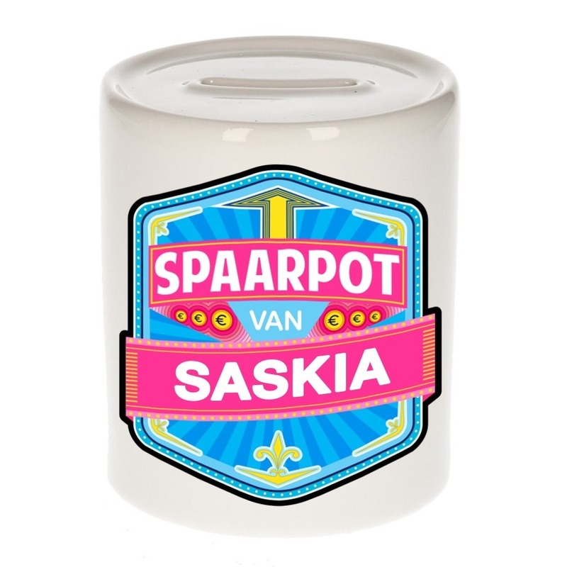 Kinder spaarpot voor Saskia. Leuke kinder spaarpot met een vrolijk gekleurde opdruk. Deze kinder spaarpot voor Saskia is gemaakt van keramiek en heeft een diameter van 8 cm en een hoogte van 9 cm.