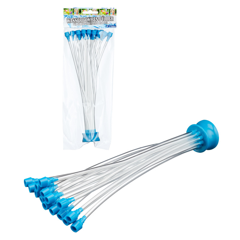 Waterballon vuller. Voor het vullen van 15 zelfsluitende waterballonnen. Gebruiksaanwijzing: u draait het blauwe uiteinde op de kraan en plaatst 15 zelfsluitende waterballonnen op de uitstekende uiteindes. Materiaal: kunststof. Waterballonnen vullers.