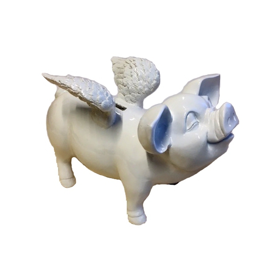 Wit spaarvarken met vleugels 25 cm. Dit bijzondere spaarvarken is gemaakt van polystone en heeft een formaat van ongeveer 25 x 14 x 15 cm.