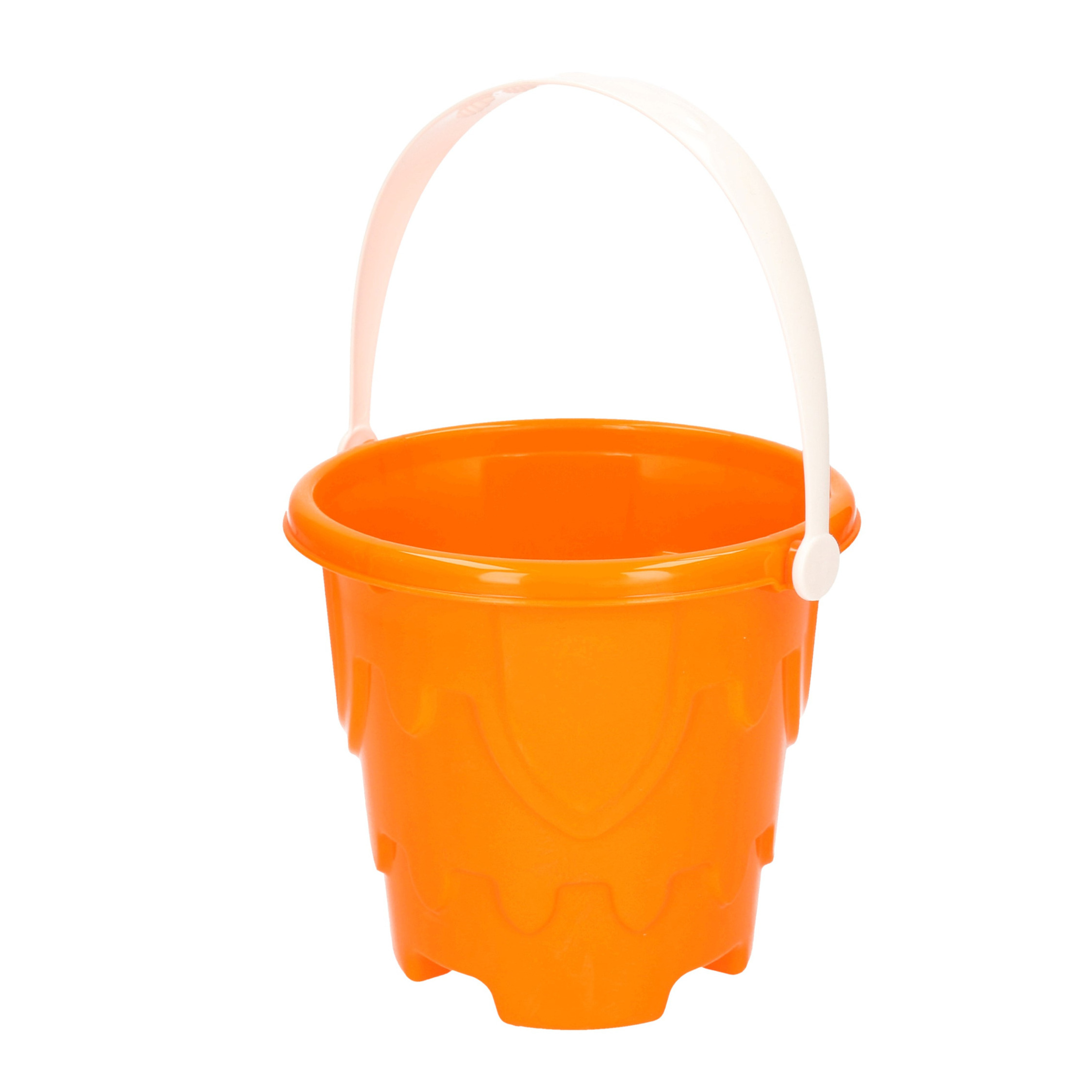 Zandkasteel emmer/strandemmertje van 18 x 16 cm in het oranje, buiten speelgoed. Strandemmertje met kasteelrelief om zandkastelen mee te bouwen. De zandvorm/emmer is gemaakt van kunststof. Formaat: ca. 18 cm in diameter en ca. 16 cm in hoogte.